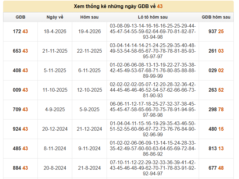 Thống kê các kỳ gần đây khi giải đặc biệt về 43 cho thấy kết quả ngày hôm sau có xu hướng phân bổ khá đều, tuy nhiên vẫn tồn tại một số quy luật đáng chú ý về đầu – đuôi và dạng số lặp lại. Việc phân tích kỹ các dữ liệu này sẽ giúp nhận diện được nhóm số tiềm năng có xác suất xuất hiện cao hơn.